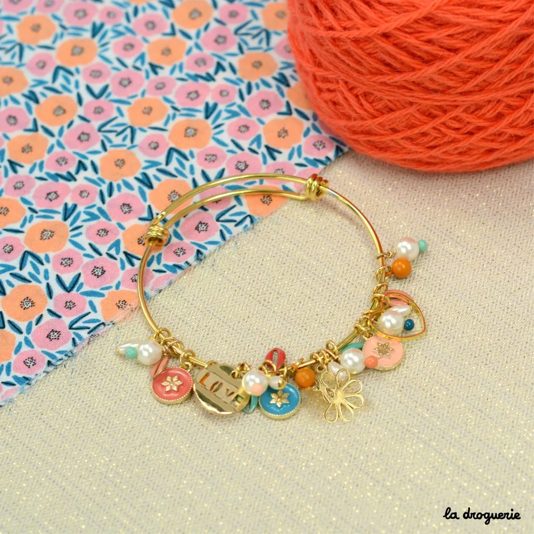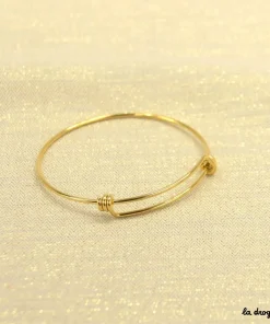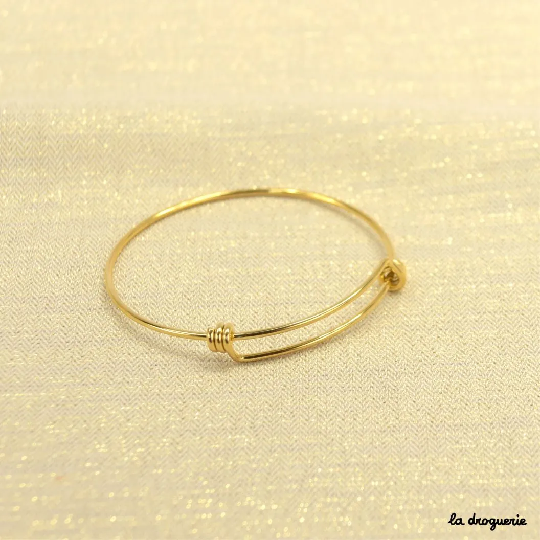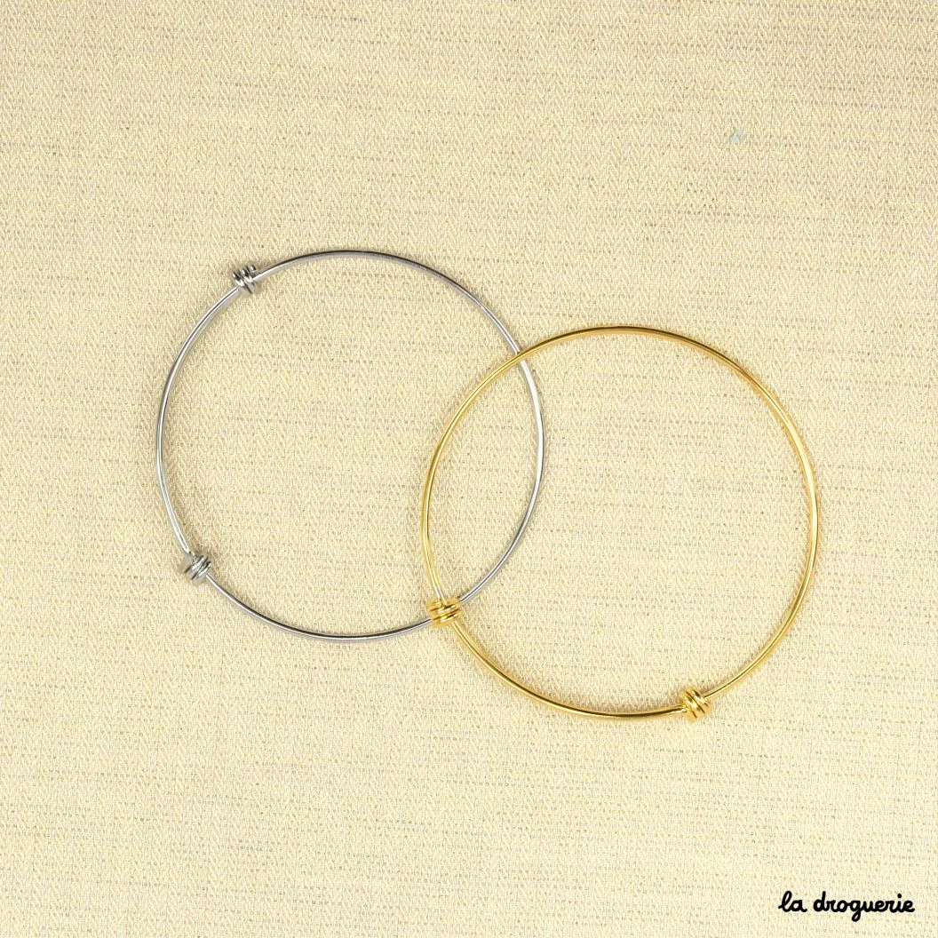 Un joli bracelet rond et fin pour y suspendre toutes vos perles et vos breloques à l’aide de petits anneaux. Pour le glisser au poignet il s’agrandit facilement. Ce bracelet est en acier inoxydable, très pratique ce métal qui ne bouge pas dans le temps.