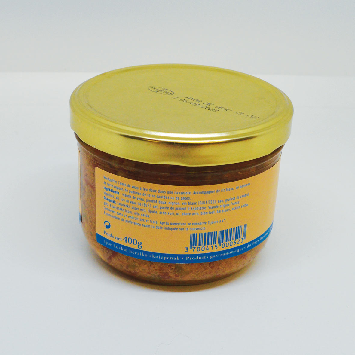 Ingrédients : viande de veau, piment doux, oignon, vin blanc (SULFITES), eau, graisse de canard, piquillos, ail, jus de veau lié (BLÉ), sel, purée de piment d’Espelette. Viande origine France.