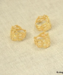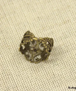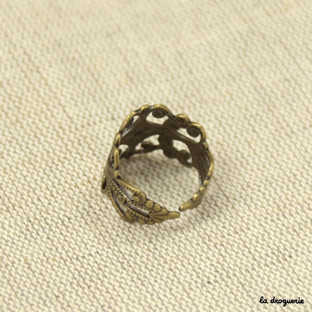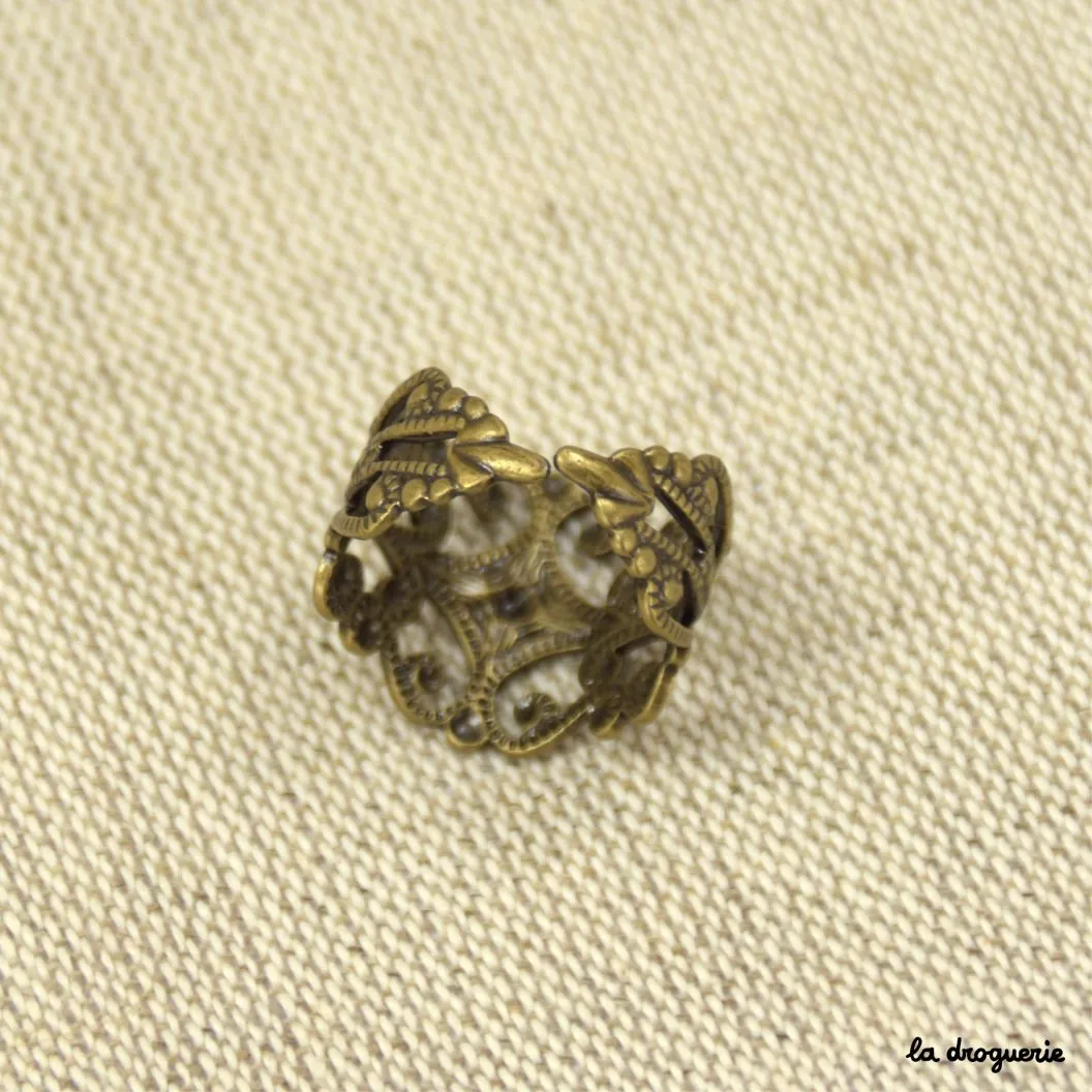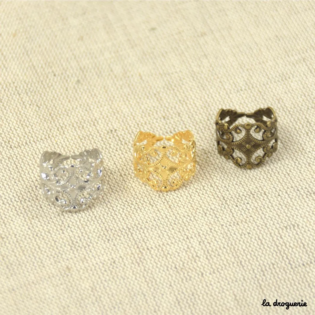 Bague arabesque d’inspiration mauresque, elle est réglable et existe en plusieurs finitions différentes, inox, doré et laiton. Composée de métal cuivreux, on peut l’agrémenter de strass ou de cabochons colorés.