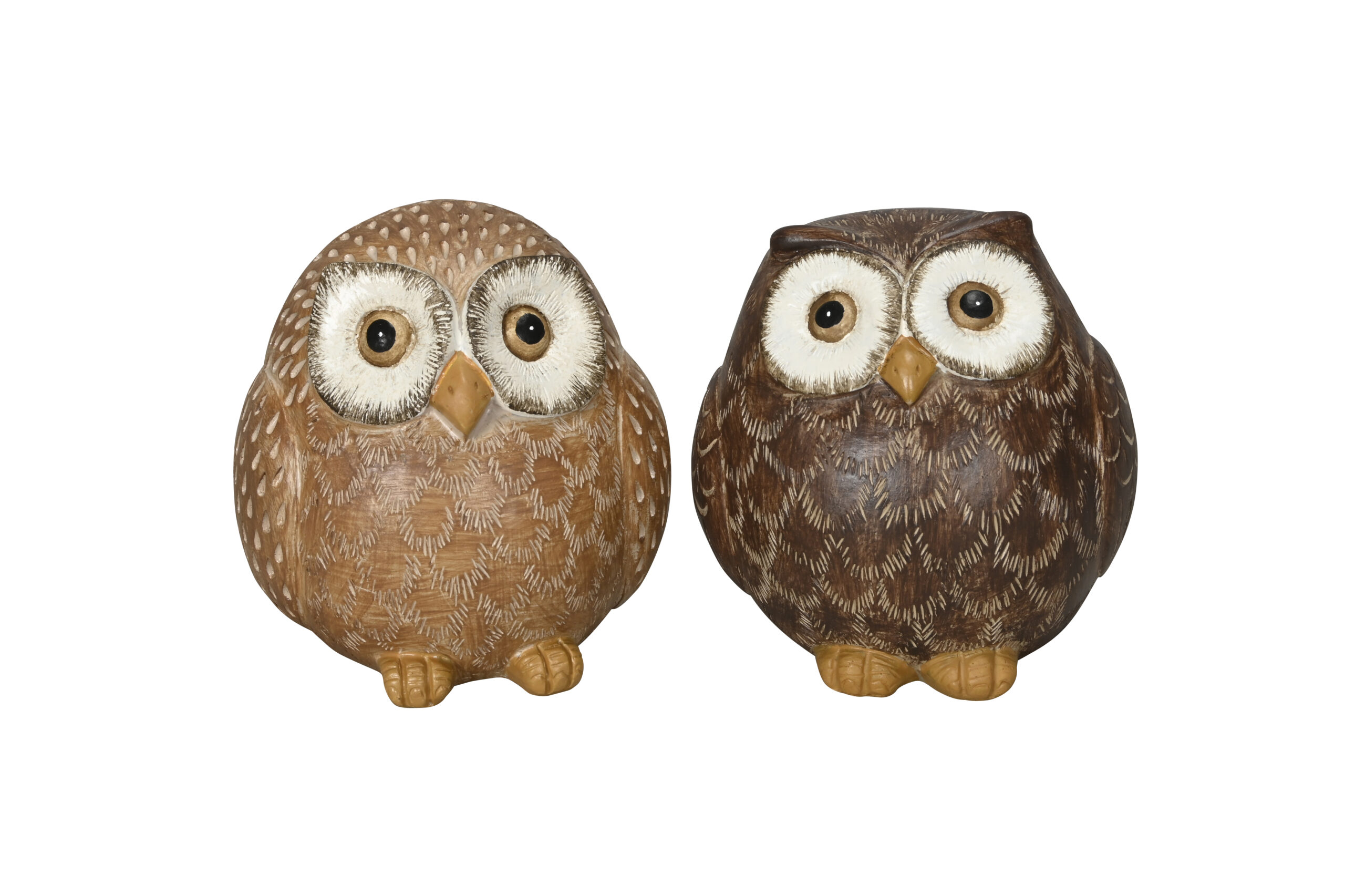 Jolie chouette en forme de boule en polyrésine brune.