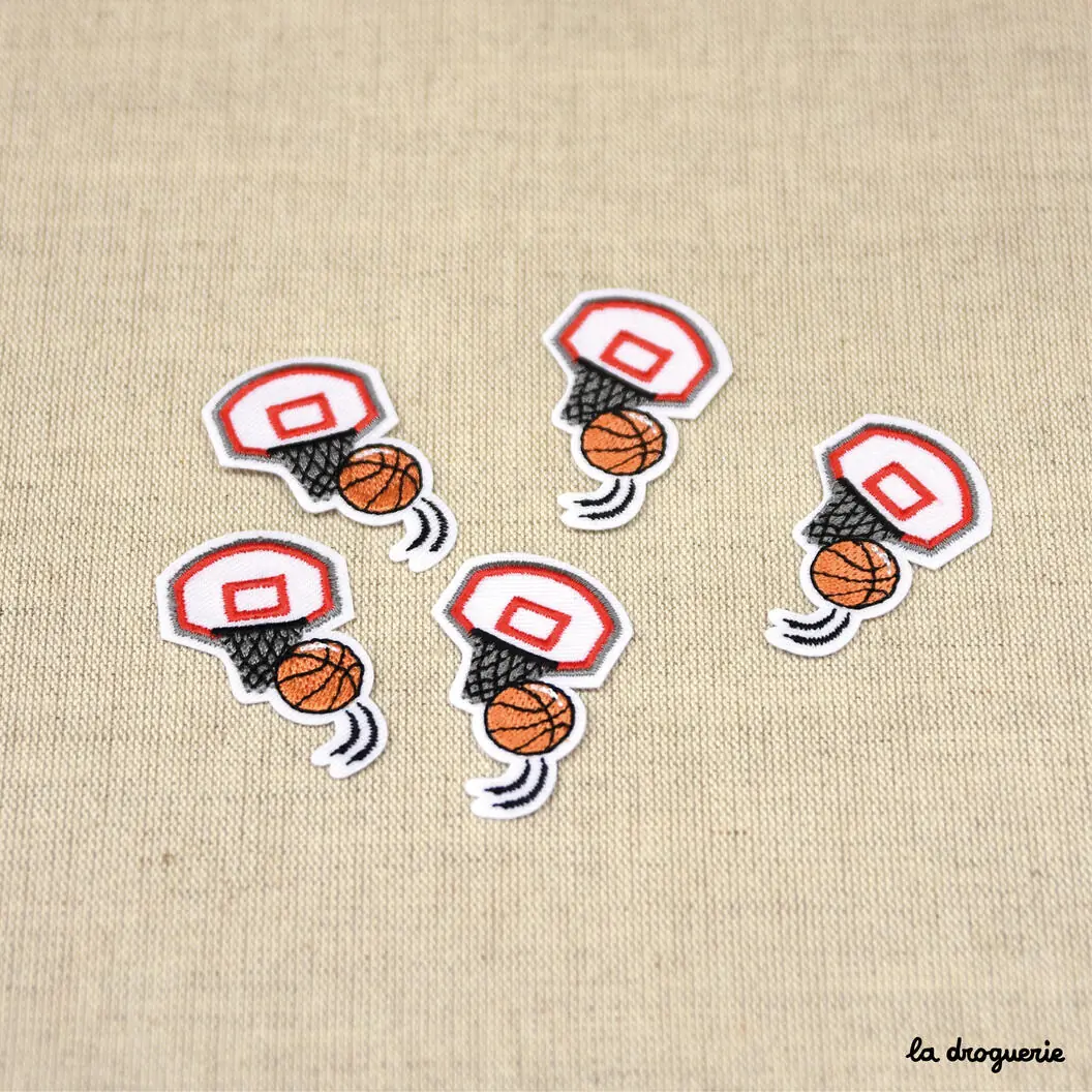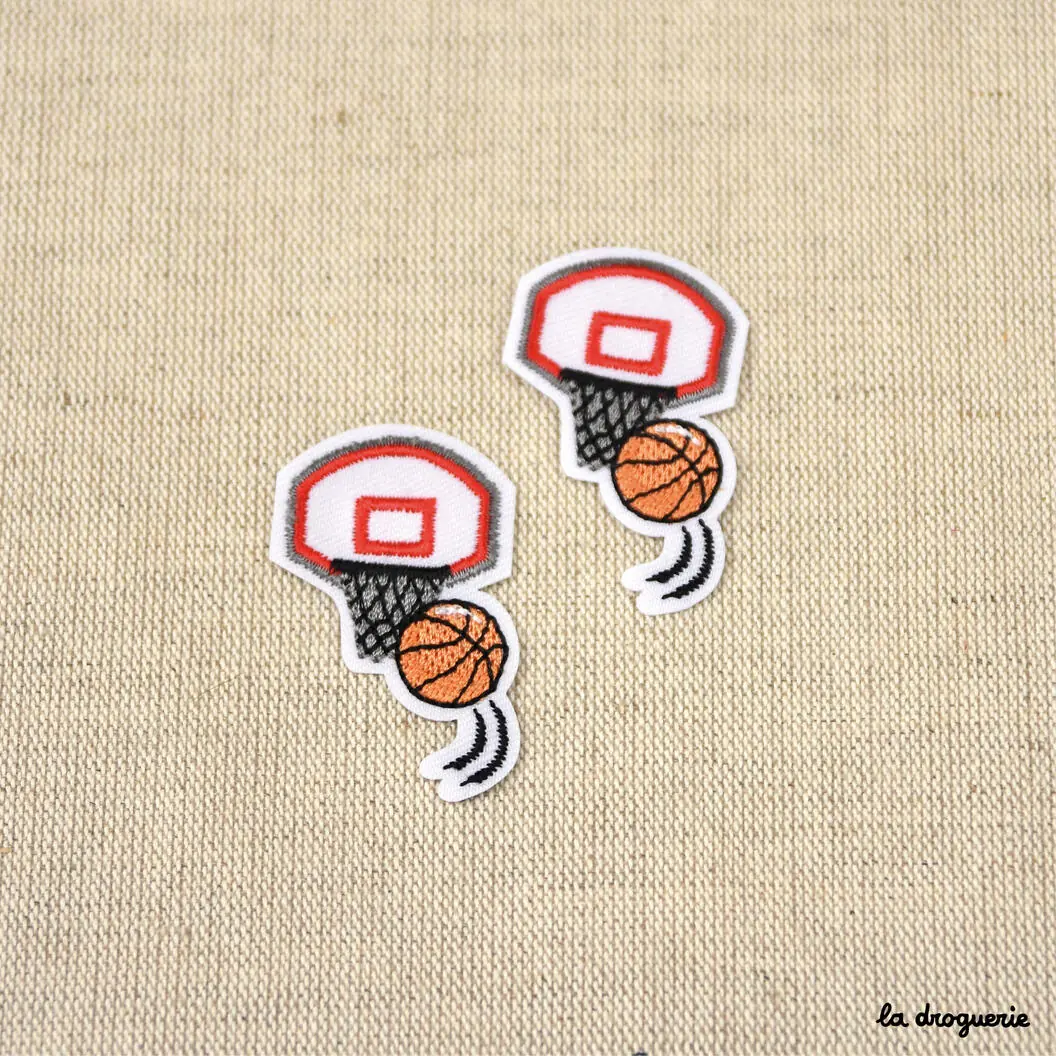 Écusson en forme de panier de basket dans lequel on projette un ballon. Sur fond blanc, le panier se dessine en noir avec le panneau bordé de lignes rouges et le ballon orangé est surpiqué de lignes noires.