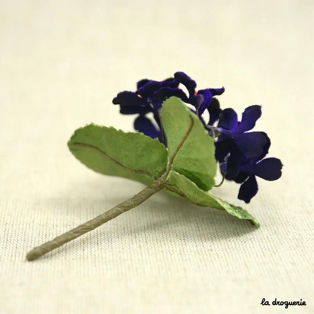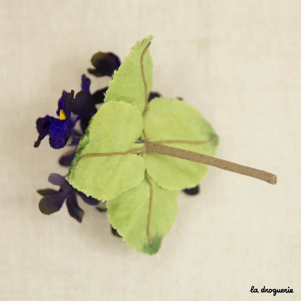 Petit bouquet de Violette en tissu velours, délicate avec ses jolis pétales violet, son pistil jaune, ses feuilles en velours et sa tige. Dans chaque bouquet, il y a huit fleurs, avec quatre feuilles et une tige. Un fil en métal est glissé à l’intérieur de la tige pour lui donner la forme que l’on souhaite. Fleur en tissu pour création modiste, idéale pour la confection d’une couronne, d’un chapeau, d’une jolie broche et même d’un bijou.