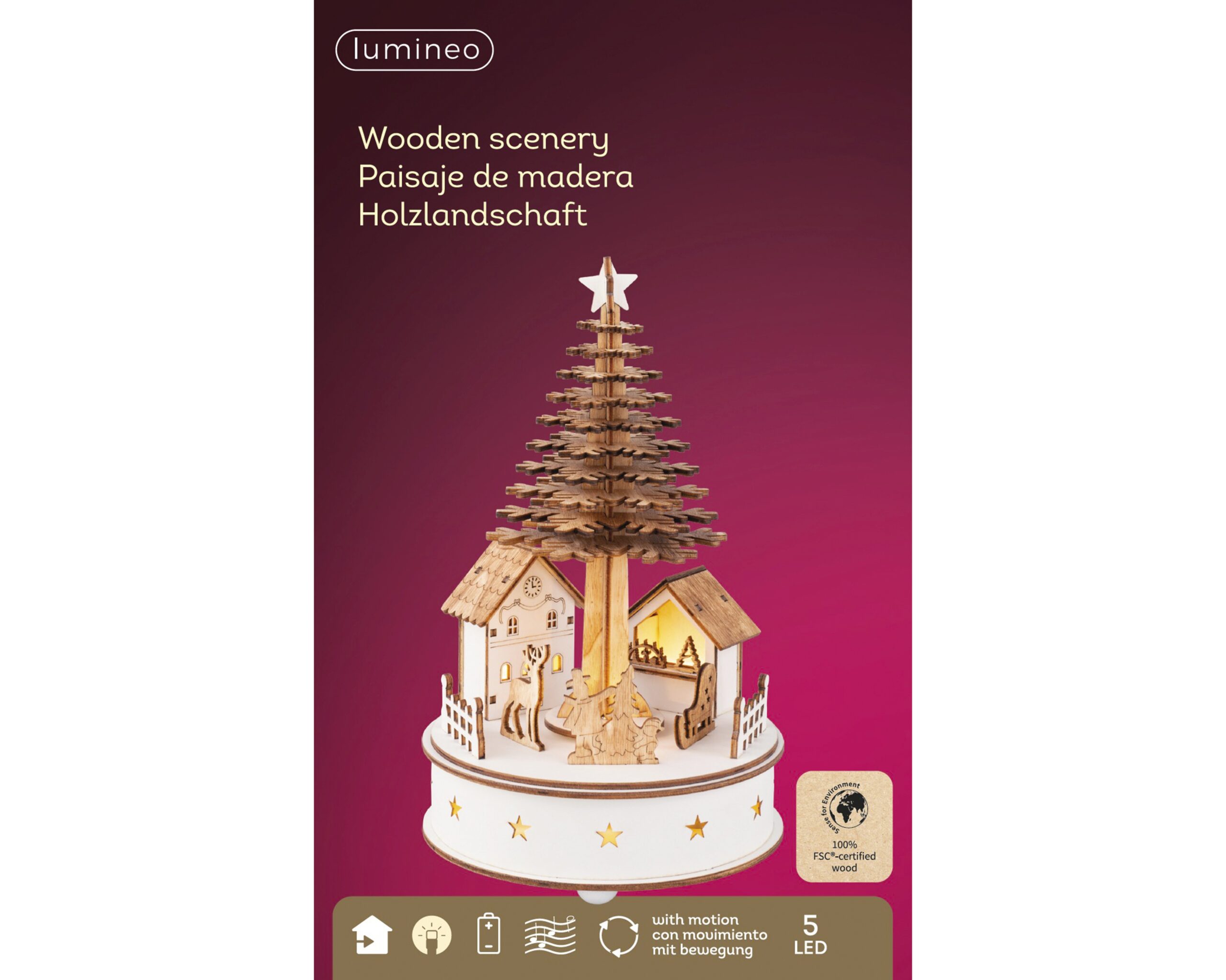 Mode de fonctionnement : fonctionne avec 3 piles AAA (non fournies). Le village est en mouvement, musical et lumineux. Possède 5 LED fonction lumière fixe.