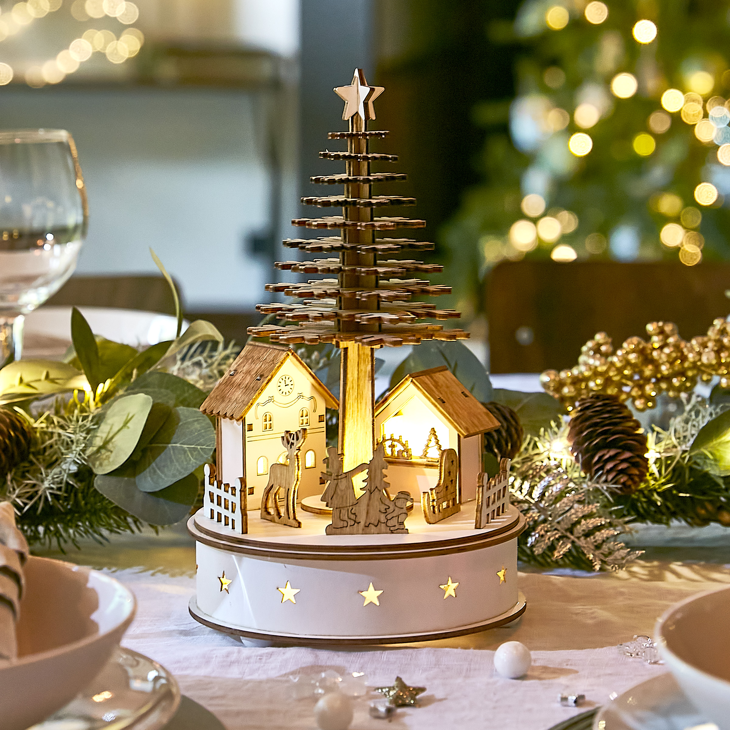 Féerie de Noël avec ce paysage de Noël enchanteur qui combine lumières douces et mélodies festives, créant une atmosphère magique et chaleureuse. Il sera idéal pour émerveiller petits et grands pendant les fêtes. Ce paysage sera tout aussi beau pour la décoration de table ou sur un buffet dans le salon.