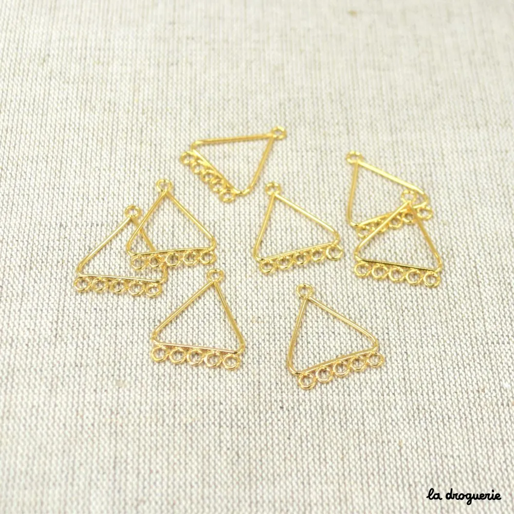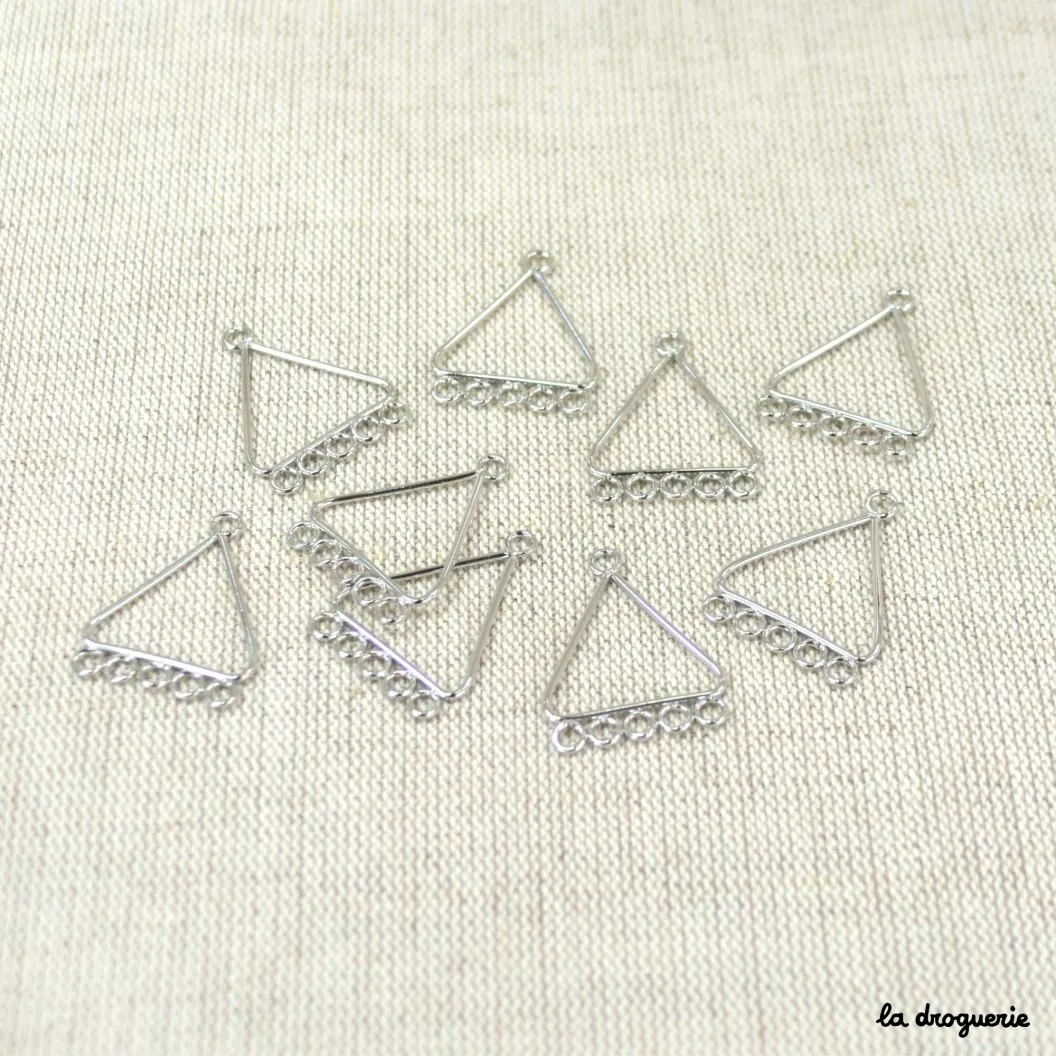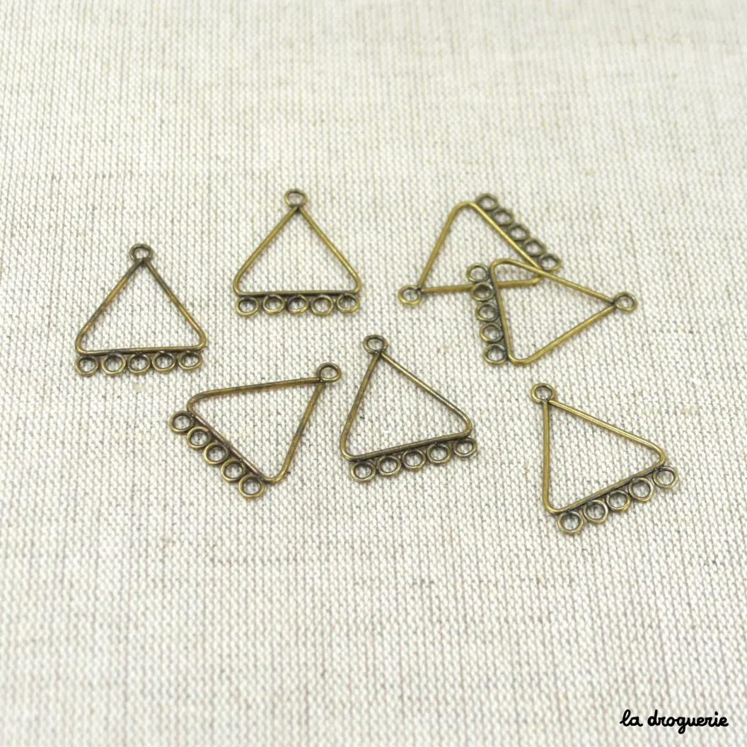 Cet accessoire forme un triangle avec 5 anneaux. On peut le suspendre à une monture de boucles d’oreilles ou à une chaîne. Aux autres anneaux, on peut suspendre avec des anneaux de raccord des breloques, des perles… Une bonne base pour des bijoux faciles et rapides à réaliser.
