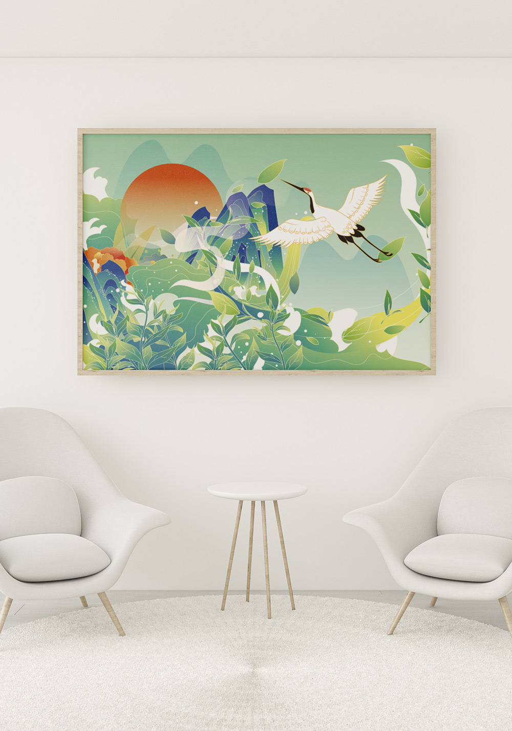 Une majestueuse grue à couronne rouge, symbole de chance et de longévité, survole les montagnes et se dirige vers le soleil levant.